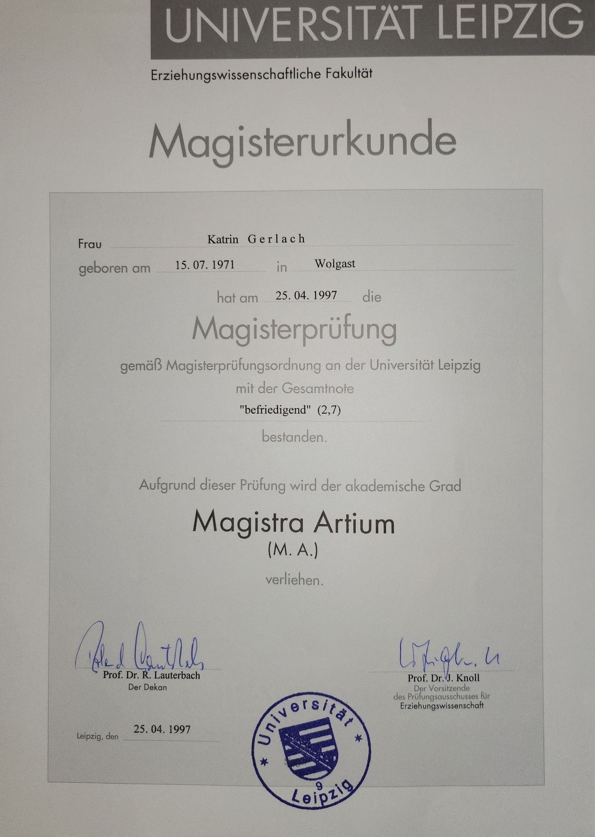 - Magister Erziehungswissenschaften mit den Nebenfächern Psychologie und Betriebswirtschaft